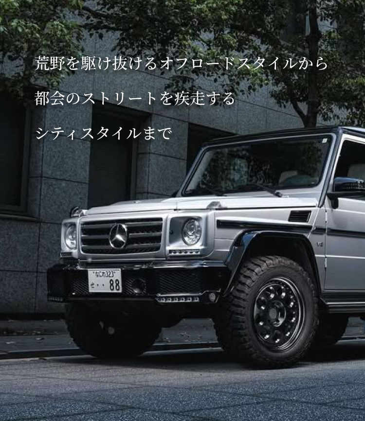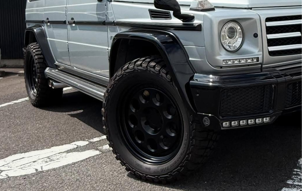 ブラバスのリップスポイラーを纏い、アグレッシブかつ洗練されたスタイルに仕上げられたGクラスに装着しても、違和感は一切ない。
